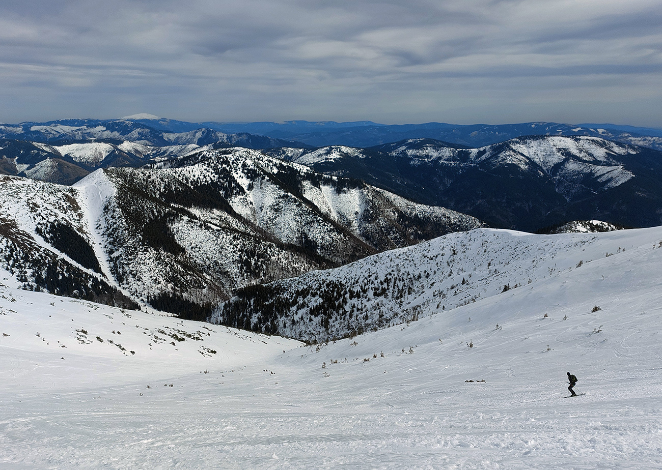 Pre zmenu by to zase chcelo pod nohy niečo mäkšie. Slnko občas prebleskuje spomedzi vysokých mrakov, nebadane sa otepľuje, tak nám do oka padá hrebienok, tentokrát ten z Králičky (z vrcholu) na juh, medzi Mlynnými dolinami. A zas je to super ako to prvé z Besnej – taká pohodová užívačka plynulých oblúkov v nie veľmi strmom svahu - v ústrety bielemu fľaku zjazdoviek v Mýte, ktoré v diaľke poriadne kontrastujú s hnedým okolím. Až dole na žltú značku nás to ale nepustí, strmá rúbaň je už vytopená. Tak nazad po vlastných stopách.